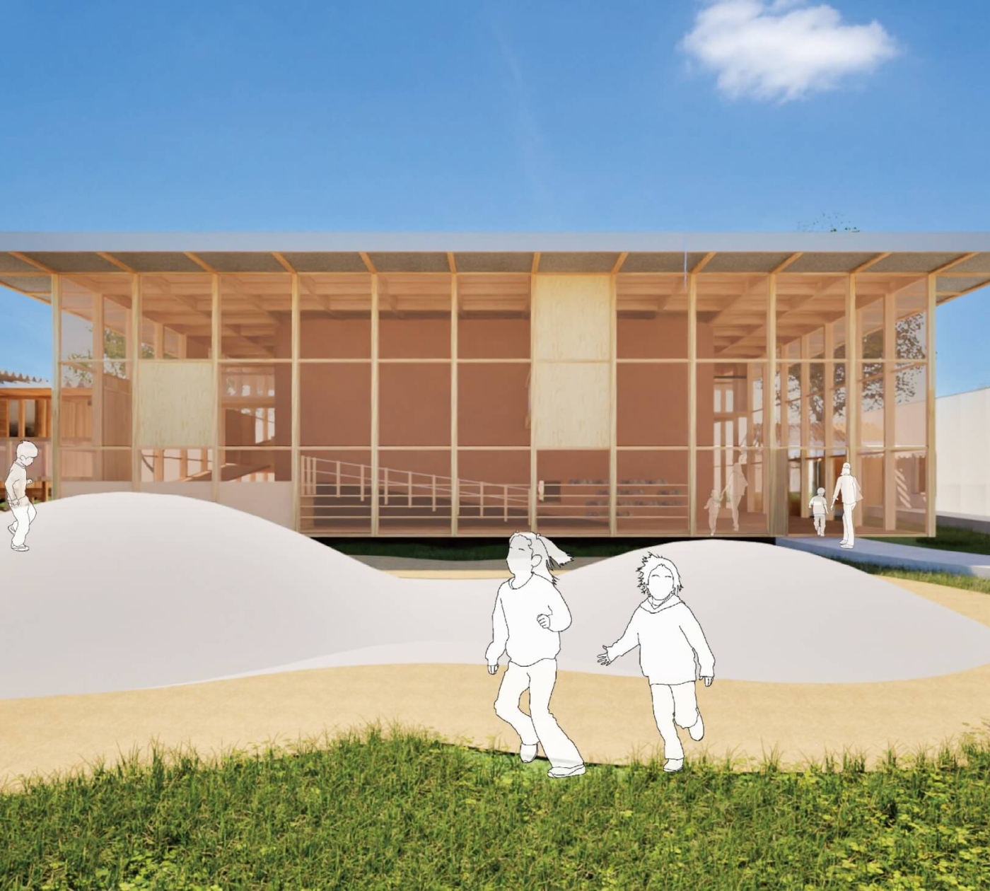 木の温もりあふれる全天候型施設に、遊具や親子のためのカフェを備え、世代を超えて安心して集える場として、日々の豊かさと未来へのつながりを育みます。